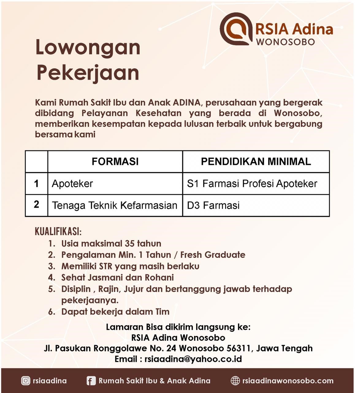 DIBUTUHKAN SEGERA TENAGA TEKNIS KEFARMASIAN DI RUMAH SAKIT IBU DAN ANAK ADINA WONOSOBO